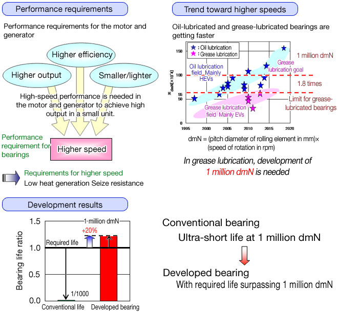 In recent years, automobile manufacturers’ need for high-speed rotation has been increasing in order to ensure power output. The need exists to simultaneously downsize and lighten drive motors and power generators to extend the running distance and improve the electricity/fuel consumption in EVs and HEVs. Bearings that support motors include oil-lubricated bearings and grease-lubricated bearings, both of which need to provide high-speed performance. Grease-lubricated bearings have the advantage that they enable a more simplified surrounding structure than that of oil-lubricated bearings. On the other hand, they present a difficult challenge in terms of achieving the necessary high-speeds.