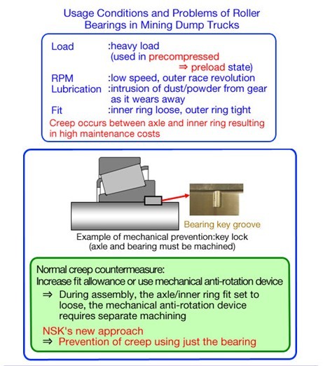 With the continuing global trend toward urbanization, global demand for natural resources continues to expand, especially among the BRICs (Brazil, Russia, India and China) and in developing countries. In recent years, this had led to mining operations running 24 hours a day, 365 days a year, which in turn requires equipment that is highly reliable under such extreme conditions. Normal tapered roller bearings are commonly used in the wheels of mining dump trucks, but inner ring creep can easily occur, resulting in axle wear. Repair of the axle wear, in turn, requires frequent maintenance time and extra expense.