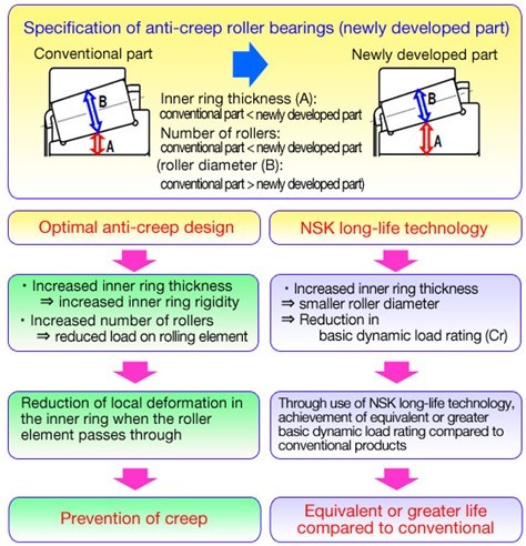 As a conventional countermeasure for this, dedicated anti-creep mechanisms have sometimes been used. However, thanks to its advanced analysis technology, testing and state-of-the-art production technology, NSK has produced a solution that involves only a specification change to the bearing itself. The result of this approach is eight times the anti-creep performance of conventional products, reduced axle wear and improved maintainability. Furthermore, NSK employs a special heat treatment process to realize increased resistance to surface fatigue on both the inner and outer ring, resulting in equivalent and greater life compared to conventional products.
